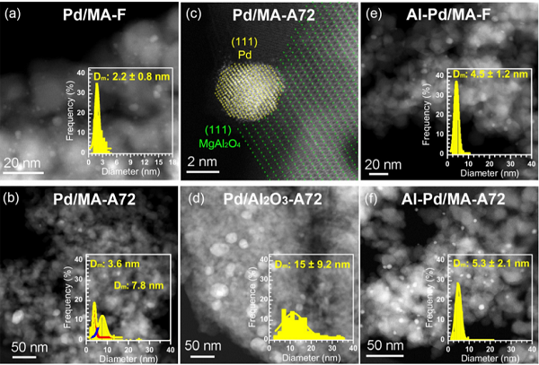 催化燃烧有望去除痕量的CH4以解决严重的环境问题。负载的Pd基催化剂是最有效的,但是由于水蒸气引起的烧结,在应用中经常稳定性较差。鉴于此,大连化物所张涛院士,乔波涛研究员,李为臻研究员与北大马丁教授开发了一种普适的策略来制备不可还原的氧化物改性的Pd/MgAl2O4催化剂,该催化剂表现出高活性和出色的稳定性,可抵抗高温下的水热老化和在潮湿条件下长期反应中的失活。不可还原氧化物的添加抑制了Pd在富氧条件下的深度氧化,不仅保留了外延结构,还保留了Pd-PdOx在MgAl2O4上的合适的活性相,从而提高了活性和稳定性。这项工作为金属氧化物相互作用对CH4燃烧的影响提供了新的见解,并为设计用于工业应用的水热稳定和活性燃烧催化剂提供了途径。