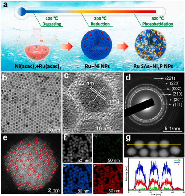 设计具有特定活性位点的催化剂是高效的氢析出反应(HER)电催化的关键但具有挑战性的任务。鉴于此,李亚栋院士团队报道了Ru单原子位点掺杂的磷化镍纳米颗粒(Ru SAs-Ni2P NPs)上原子分散的Ni-Ru-P界面位点(ISs),并在宽的pH范围内具有高效的HER性能。尤其是,在2.20 wt%的Ru SAs-Ni2P上原子分散的Ni-Ru-P ISs表现出高催化活性,在低超电势下具有高周转频率,具有很高的质量活度以及在碱性条件下的优异稳定性。根据操作X射线吸收光谱实验表明,Ni-Ru-P ISs在HER过程中起积极作用,并参与催化过程。密度泛函理论计算表明,原子分散的Ni-Ru-P ISs中的强相互作用导致优化的氢吸附能和升高的羟基吸附能,两者均有助于改善HER性能。值得注意的是,这项工作为通过构建原子分散的IS来设计高效HER电催化剂提供了新的策略。