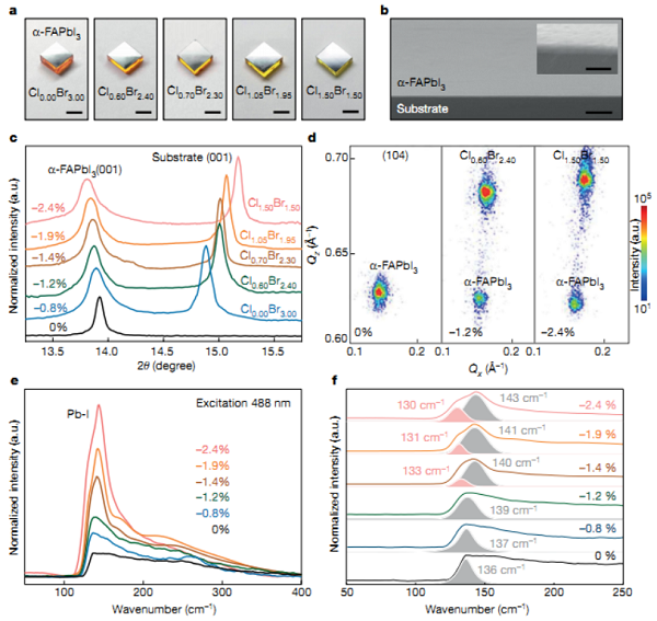 加州大学圣地亚哥分校徐升报道了晶格不匹配的卤化物钙钛矿衬底上卤化物钙钛矿单晶薄薄膜的外延生长。作者使用实验技术和理论计算方法研究了α-FAPbI3的应变工程。通过调整衬底的成分-从而调整其晶格参数-将高达2.4%的压缩应变应用于外延α-FAPbI3薄膜。作者证明了该应变有效地改变了晶体结构,减小了带隙并增加了α-FAPbI3的空穴迁移率。由于外延稳定和应变中和的协同效应,应变外延还显示出对α-FAPbI3相具有实质性的稳定作用。例如,应用应变工程技术来增强基于α-FAPbI3的光电探测器的性能。