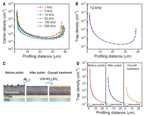 北卡罗来纳大学教堂山分校黄劲松报道的金属卤化物钙钛矿单晶和多晶太阳能电池中陷阱态的空间和高能分布的分析。单晶中的陷阱密度变化了五个数量级,最低值为每立方厘米2×1011,大多数深陷阱位于晶体表面。多晶膜界面的所有深度的电荷陷阱密度比膜内部的电荷陷阱密度大一到两个数量级,并且膜内部的陷阱密度仍然比高密度薄膜中的陷阱陷阱密度大两到三个数量级。出乎意料的是,表面钝化后,在钙钛矿和空穴传输层的界面附近发现了大多数深陷阱,其中嵌入了大密度的纳米晶体,从而限制了太阳能电池的效率。