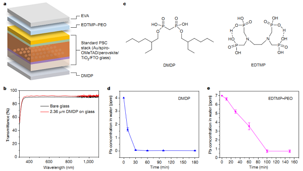 北伊利诺伊大学徐涛和可再生能源国家实验室朱凯提出一种化学方法来隔离由于严重损坏设备而导致的超过96%的铅泄漏的设备上隔离。铅吸收材料的涂层被应用到设备堆栈的正面和背面。在前透明导电电极的玻璃侧,作者使用了透明的吸收铅的分子膜,该膜包含与磷牢固结合的膦酸基团。在背面(金属)电极侧,作者将与铅螯合剂共混的聚合物薄片放在金属电极和标准光伏填料薄片之间。浸水时,两侧吸铅膜会膨胀以吸收铅,而不是溶解,从而保持结构完整性,以便在损坏后容易收集铅。