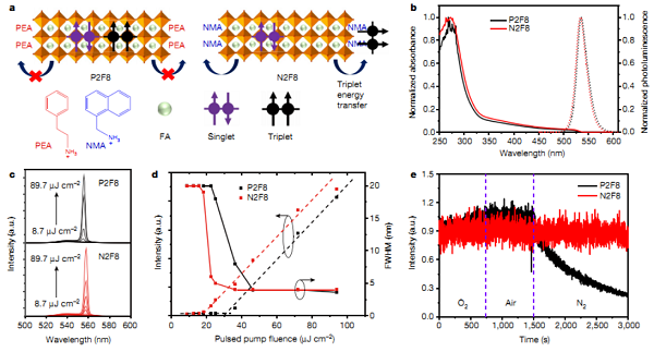 中科院长春应用化学研究所和日本九州大学Chihaya Adachi研究了基于卤化铅的具有不同有机阳离子的准2D钙钛矿薄膜,并观察到长寿命的三重态激子在加倍自发发射以及光泵浦脉冲和CW激光过程中显着阻碍了人口反转。结果表明,单重态-三重态激子湮灭是引起激光死亡的可能的内在机制。通过使用具有高品质因数的分布式反馈腔并应用三重态管理策略,可以在室温下在空气中连续光泵浦下获得稳定的准2D钙钛矿绿色准激光器。希望这个发现将为实现未来的电流注入钙钛矿激光器铺平道路。