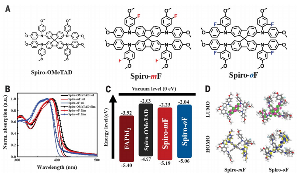 钙钛矿太阳能电池(PSC)性能的进一步改善和稳定性对于实现下一代光伏产品的商业可行性至关重要。考虑到氟化能使共轭材料具有能级,疏水性和非共价相互作用的优点,蔚山国立科学技术学院和韩国能源研究所开发了两种众所周知的空穴传输材料(HTM)Spiro-OMeTAD的氟化异构体,并将其用作PSC中的HTM。通过实验,原子和理论分析研究了由结构异构引起的结构-性质关系,所制备的PSC具有高达24.82%的高效率,并且在潮湿条件下无需封装即可具有长期稳定性。 在大面积电池中,我们还可以达到22.31%的效率。