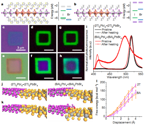 普渡大学的Brett M. Savoie和普渡大学窦乐天以及上海HTH官网地址 大学的于奕报道一种有效的策略,通过结合刚性的π-共轭有机配体,基本上抑制了二维卤化物钙钛矿中的面内离子扩散。作者展示了高度稳定和可调的横向外延异质结构,多异质结构和超晶格。低剂量像差校正的高分辨率透射电子显微镜揭示了近原子尖锐的界面和外延生长。分子动力学模拟证实了在共轭配体存在下二维钙钛矿的减少的异质结构紊乱和更大的空位形成能。这些发现为卤化钙钛矿半导体的固定和稳定化提供了见识,并展示了用于复杂且分子薄的超晶格,器件和集成电路的材料平台。