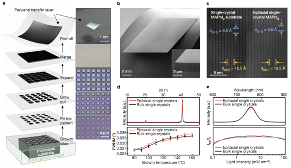 加州大学圣地亚哥分校徐升报道了一种基于溶液的光刻辅助外延生长和转移方法,可在任意衬底上制造单晶杂化钙钛矿,并精确控制其厚度,面积,并且厚度方向上的成分梯度。转移的单晶杂化钙钛矿的质量与直接生长在外延衬底上的钙钛矿的质量相当,并且可以机械固定,具体取决于厚度。铅锡梯度合金可形成梯度电子带隙,从而增加载流子迁移率并阻碍载流子复合。基于这些单晶杂化钙钛矿的器件不仅显示出对各种降解因子的高稳定性,而且还具有良好的性能。