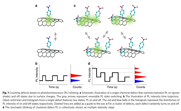 首先要解决的第一个问题是如何计算化学缺陷。作者的计算方法是基于缺陷光致发光(PL)随机闪烁的定量分析,对于只包含一个缺陷位的发射位点,假设PL是以恒定的强度步长闪烁(图1a, b);而对于含有多个缺陷的发射位点,PL时间轨迹将随着缺陷数量的多少产生变化的的强度状态和多种步长。例如,当三个缺陷独立闪烁时,它们将共同产生四种PL强度状态和三种步长(图1c, d)。此外,相邻的缺陷也可能以一种相关的方式闪烁,例如两个或两个以上的缺陷同步地打开或关闭。作者用一种等效于随机光学重建显微镜中使用的超分辨率方法来检索缺陷位置。通过分析单缺陷发射点荧光闪烁的双态特性及其超分辨位置,可从光学上识别单个缺陷。