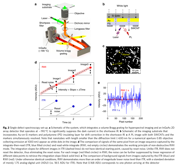 为了检测短波红外中单个缺陷产生的极低光线,作者集成了一个优化后可在-190℃下运行的液氮冷却的InGaAs探测器阵列(Cougar 640)。有一个点值得注意的是,液氮冷却InGaAs探测器通常在温度不低于100 ℃下运行,冷却到接近液氮的真实温度时会抑制暗电流达到10 e– pixel–1 s–1,这比冷却到−100 °C的InGaAs探测器低500倍。系统的另一个功能是实现了一种读时集成(RWI)的读出模式,这大大降低了读取噪声。与传统的集成-然后读取(ITR)模式不同,RWI是无损的,它消除了复位和读取噪声。图2d对比了两种模式捕获的图像序列中同一像素的信号,展示了RWI的工作原理。在RWI模式下,读取信号不需要复位检测器,而ITR模式则是每次读取信号后都需要复位。由于每次复位得到像素值都有稍微的不同,所以ITR模式中的复位噪声很明显(图2d)。而RWI模式因为不需要复位就没有这一项的影响。RWI中的噪声可以通过线性回归进一步抑制以消除读取噪声。对于每个图像,作者累积n个读出,从下列式子中计算每个像素的斜率: