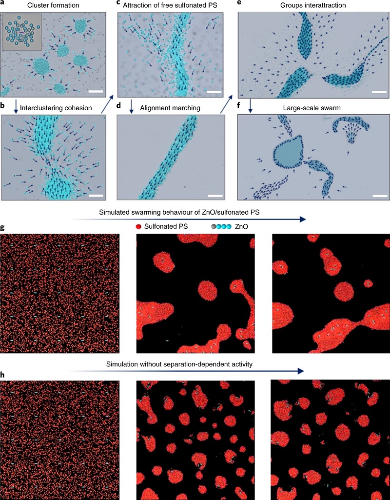 综上所述,作者展示了ZnO纳米棒和磺化PS微球之间的离子交换相互作用,以及由此产生的集体智能行为。通过将ZnO纳米棒和磺化PS微球混合,形成了ZnO-磺化PS复合物,并且从微观到宏观建立了群聚、相分离和集群共识行为。作者的数值模型表明,非互易性相互作用对于这些丰富的集体行为的出现至关重要。该研究结果表明,离子交换反应可能是构建活性粒子之间复杂的化学相互作用的一种通用工具,对于理解和设计新的响应性活性物质具有重要意义。