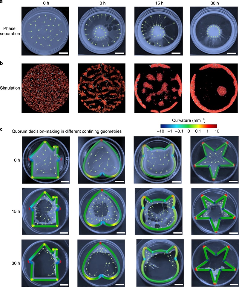 复杂性系统一般特指由大量去中心化的基本单元集合而成的体系。在这种系统中,每个基本单元从个体上看很相似而且遵从一定的运动规则。通过大量个体单元的相互作用,复杂性系统涌现出神奇的集群行为、复杂的信息处理和自适应现象。例如自然界中的鱼群、鸟群和菌群。近年来,人工合成活性物质由于其在生物医学领域的潜在应用价值,以及可作为非平衡态物理和凝聚态物理的理想模型体系,从而引起了研究人员的兴趣。值得注意的是,具有复杂功能的活性纳米颗粒被认为是可以用于复杂任务的微型机器人。然而,由于尺寸所限,将复杂的逻辑电路整合到单个微纳机器人中还面临巨大的挑战,限制了其功能。因此,目前需要探索利用大量简单粒子,通过建立粒子间的相互作用网络产生的集体智能,以实现高级复杂的功能。