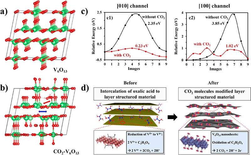 (d)将草酸插入层状的V6O13材料(之前)和掺入CO2分子的层状V6O13材料(之后)。