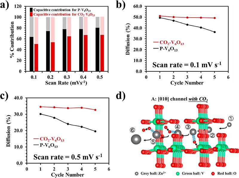 (a)Zn//P-V6O13和Zn//CO2-V6O13的贡献百分比(扩散和表面电容);