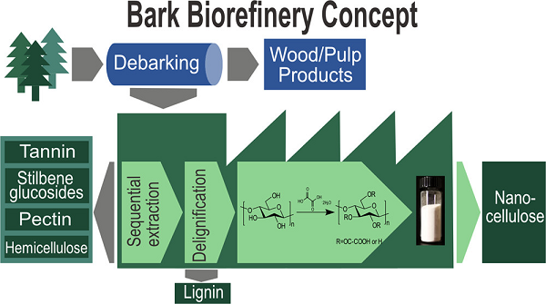 纳米纤维素的生产处于不断发展的状态,重点在于降低生产成本以及将不同的官能团引入纤维素结构中。草酸纤维素(COX)是通过使纤维素纤维与熔融的草酸二水合物反应而制得的,而草酸二水合物在102°C时相对较低的熔点使得无溶剂反应成为可能,并使该方法成为其他方法的绿色替代品。可以通过草酸纤维素分离纳米纤维素用于从木材中漂白的牛皮纸浆和溶解浆,其中大部分木质素,半纤维素和杂质被去除。而在林产品工业中生产木浆和材料时,也会产生大量副产品,尤其是树皮。合理利用树皮,将可以使效益变得更加好。