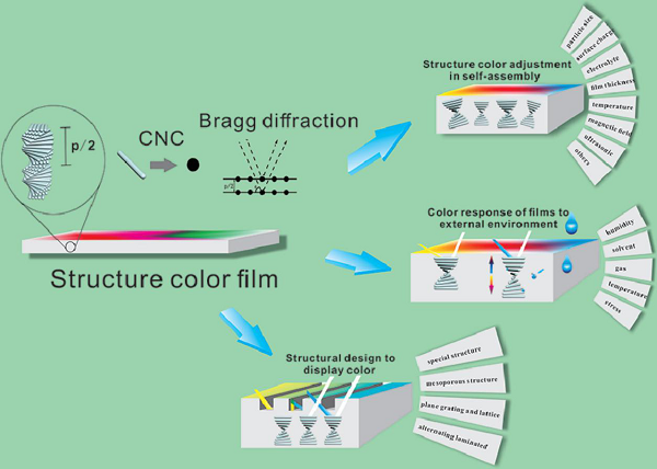 结构色,也称为物理色,是由没有任何颜料的纯物理结构产生的颜色。常规彩色显示器在使用染料或颜料通过选择性地吸收和反射光产生典型颜色,而结构颜色通过光散射,衍射和干涉有序的结构周期性产生的。与使用染料或颜料的方法相比,结构色的生产具有多个优点,包括将光源转换为颜色的高效效率,环境友好性以及如果材料的结构没有损坏或变形的情况下仍能保持稳定的长期颜色。纤维素纳米晶体(CNC)对环境无害,并且源自植物,细菌或被膜。CNC控制器是纺锤状纳米级材料的独特性质,例如高强度,高比表面积,高的热稳定性,光透过性,生物降解性,生物相容性和自组装能力。在结构彩色显示有良好的前景。