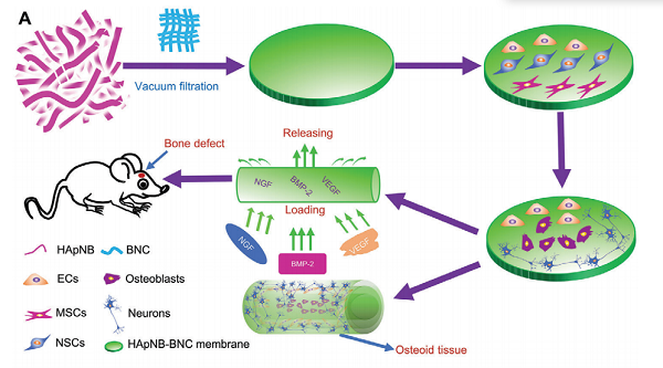 严重骨缺损的临床治疗,尤其是血管和周围神经损伤引起的组织损伤,仍然是一个巨大的挑战,常常导致骨不愈合和其他后遗症。因此,支架被设计成模拟天然组织,可在下一代组织工程中使用。同时与骨骼组织工程支架相关的大多数研究都集中在成骨细胞的分化上,因为促进新的骨骼生长是骨骼再生的主要目标。羟基磷灰石(HAp)是骨骼组织的重要无机成分,已广泛应用于骨骼再生,药物载体系统,肿瘤治疗和细胞成像等领域。细菌纳米纤维素(BNC),可生物降解的材料的亲水性和优异的载药量和机械性能,已在体外在伤口愈合,药物递送,以及仿生组织模型的重构应用。考虑的BNC和有效成骨能力和HAP的强度的显着的特性,两者集成用于骨骼再生支架是一种很有前途的策略。