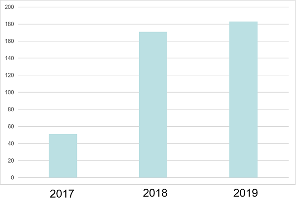 Joule在2017年的发文量为51篇,在2018年的发文量为171篇,在2019年的183篇。Joule的终极目标是要做能源领域的Science、Nature、Cell,这个定位是非常高的,因此在发文量方面还需要跟进NCS的步伐。