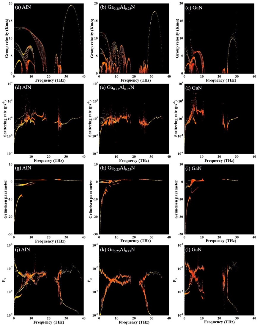 从三种材料的声子热输运分析发现,Ga0.25Al0.75N合金热导率高于其母本二维GaN的主要原因在于其相对高的群速度以及小的散射象空间,这与合金化过程中产生的孤立的光学声子分支密不可分。