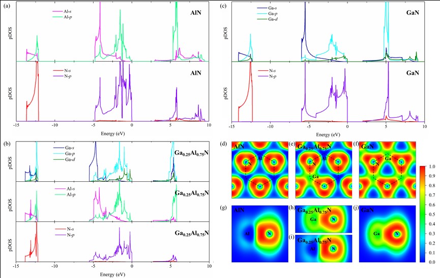 不难发现,Ga0.25Al0.75N合金中,Ga-p 和 Ga-d轨道对于sp2杂化的轨道贡献呈增强趋势,而N-p轨道贡献有所弱化,因此所造成的Ga0.25Al0.75N合金中 Ga-N键的极化程度明显弱于GaN,这种弱化的极化键强度削弱了声子之间的散射过程,相比于GaN,一定程度上增加了合金的热导率。