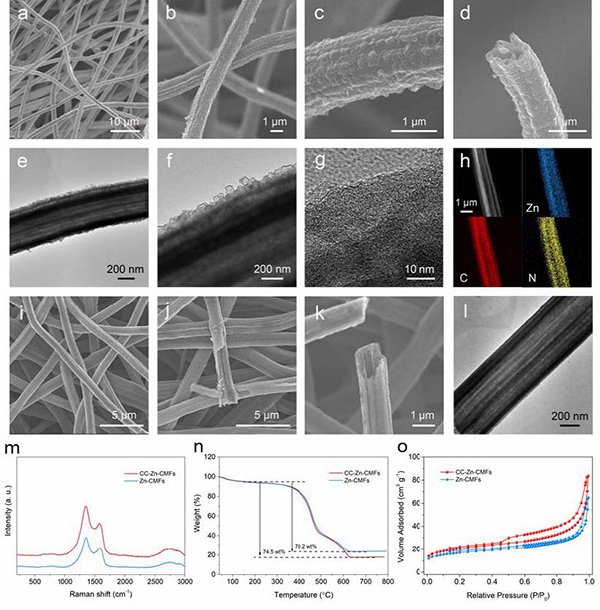 (a-h)CC-Zn-CMFs的FESEM和TEM图像及相应元素映射。