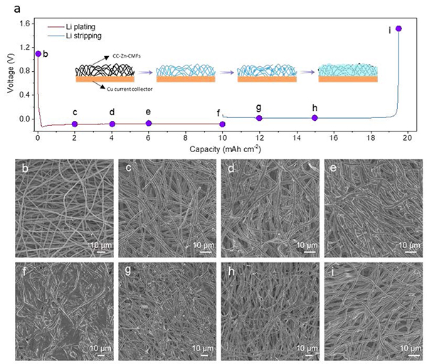 (a)在容量为10 mAh cm-2的情况下,CC-Zn-CMFs电极在1 mA cm2下的电化学Li沉积/剥离曲线。