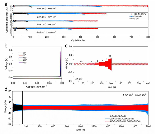 (d)在1 mA cm-2的对称电池中,容量为1 mAh cm-2的b-Cu-Li,Zn-CMFs-Li和CC-Zn-CMFs-Li阳极的电压-时间曲线。