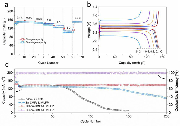 (a)CC-Zn-CMFs-Li // LFP全电池的倍率性能。