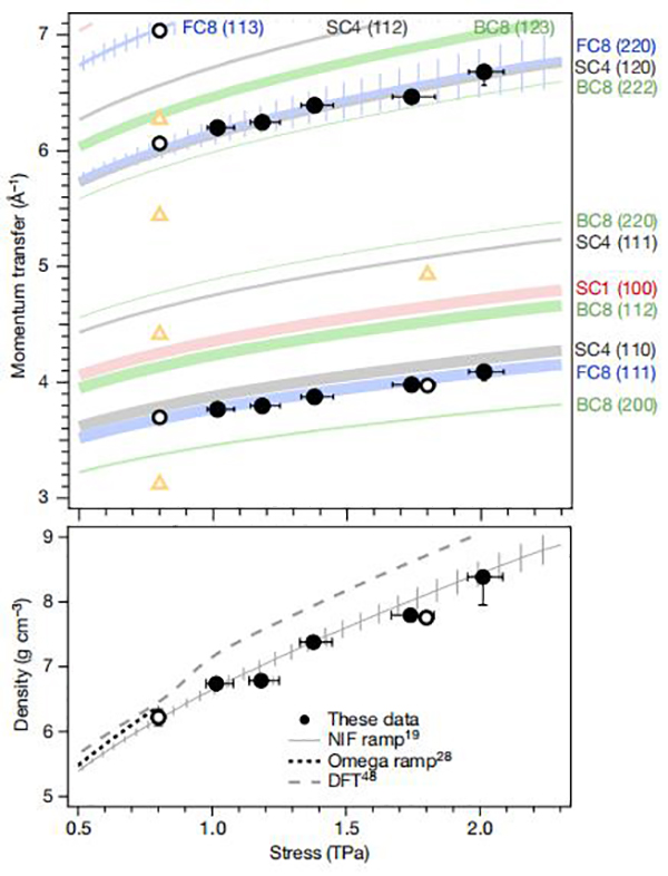 碳是宇宙中第四大元素,对所有已知生命都是必不可少的。在地球上,碳可以以许多不同的同素异形体的存在,包括石墨、金刚石和富勒烯,而且长期以来一直预测,在压力大于地球核心的压力下,甚至可以存在更多的结构。同时已经预测行星系统中存在几个阶段,这对于精确模拟富碳系外行星内部非常重要。在实验过程中,尽管可以通过冲击压缩获得如此高的压力,但根据对衰减的冲击波中所表现出的熵变化的研究,这种高度熵的过程开始熔化高于0.6 TPa的金刚石。但是,近来已经开发了一种称为斜波压缩的新动态技术,其中与通过样本的声波传播时间相比,样本的压缩时间更长,从而减少了耗散过程。但是,这些研究都没有包括对结构的测量,实际上,由于在各相之间存在巨大的势垒,因此在实验室压缩中金刚石是否,以及如何转变是困难的问题。