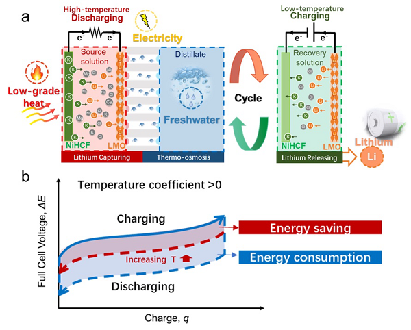 近日,悉尼大学博士生袁梓文和余彦熹(共同第一作者)在通讯作者陈元教授指导下,在ACS Applied Materials & Interface 期刊上发表了题为Thermo-osmosis-Coupled Thermally Regenerative Electrochemical Cycle for Efficient Lithium Extraction 的文章。这项工作提出了一种可实现从水中高效快速提取回收锂资源的新技术。该新技术耦合了热渗透和热再生电化学循环两个过程(Thermo-osmosis-Coupled Thermally Regenerative Electrochemical Cycle,TO-TREC),具有以下几个优势:以低品质热源(温度< 100 ℃,如地热资源,工厂废热,太阳能等)作为热能来源,热渗透系统可以将绝大部分的低浓度含锂原水进一步的浓缩(如海水淡化厂所产生的反渗透浓水,工业废水等),且浓缩的速度远高于传统的太阳能蒸发。于此同时,高纯度的纯水可作为附加产物从该系统中产出;通过电化学系统,可从经热渗透系统加热浓缩的含锂原水中高选择性的提取回收锂资源;构建热再生电化学循环,即从相对高温的含锂原水中提取锂后,将电极转移至常温的回收液中释放电极上提取的锂,不仅可以完成高纯度氯化锂的回收,还可以实现热能转化为电能,从而减少电化学过程的电能消耗。本研究选用以锰酸锂(lithium manganese oxide, LMO)和亚铁氰酸镍(nickel hexacyanoferrate ,NiHCF)作为电极,对水中锂的提取速率可达到50-60 mmol Li+ 每平方米电极每小时。因为LMO/NiHCF 所组成的电化学系统的具有正温度系数(实验测得为0.843 mV K-1)。所以在回收锂的过程中,可同时实现低品质热能转化为电能。相较于传统恒温的电化学提取锂技术,该TO-TREC系统的电能消耗可减少20%以上。TO-TREC技术是一种高效、多功能且环境友好的锂资源提取回收技术,具有广阔的应用前景。