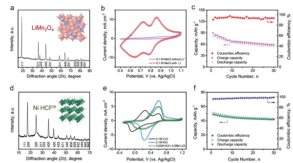 电极表征实验表明较高的温度(60 ℃)不会对LMO 和 NiHCF电极的的物化性质及电化学性能产生明显的负面影响。首先XRD实验表征显示LMO和NiHCF材料的晶格结构在温度较高条件下充放电之后也不会有明显的变化(图2a 和 d)。LMO在温度较高的条件下仍能对溶液中的锂离子有很高的选择性(共存离子包括钠、钾、钙、镁等,如图2b)。而NiHCF电极则对钾离子有更高的选择性,以保证了其在回收溶液中能优先与钾离子而不是锂离子进行反应 (图2e)。LMO和NiHCF电极在60 ℃下进行充放电循环仍能够表现出较高的库伦效率以及充放电容量(图2c和f)。