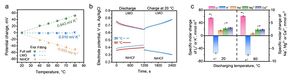 通过实验测试表明,LMO/NiHCF 电池系统的温度系数为0.843 mV K-1 (图3a)。因此在高温下(60 °C)恒流放电时,其放电电压会比常温(20°C)下高(LMO电极的放电电势提高,NiHCF电极的放电电势降低),从而释放更多的电能 (图3b)。将放电后的电极放入常温(20°C)的回收溶液中,其充电电压则恢复到与常规操作一致,因此充电所消耗的能量不变 (图3b)。所以综合两步来看,在高温下放电提取锂、在低温下充电释放回收锂的操作相较于恒温充放电的传统操作步骤所消耗的电能减少。而从回收锂的表现来看,两种操作步骤在回收溶液中所获得的锂离子增长量相似 (甚至高温放电的操作最终回收的锂离子更多),且对于其他共存阳离子(钠、钙、镁等)的选择性很高 (图3c)。