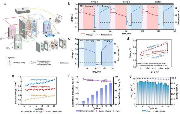 为了进一步验证TO-TREC系统的可行性,搭建了实验室规模的测试系统(图4a)。含锂的原水为模拟的盐湖水(NaCl (3 M), MgCl2(0.6 M), and LiCl, KCl, CaCl2 (各30 mM))。其中Mg2+/Li+ 的质量比达到70.03,传统的蒸发浓缩化学沉淀的方法很难从中提取锂。而使用TO-TREC系统,在本实验的条件下,因高温下的放电提取锂过程相较于常温时释放更多的电能,TO-TREC的电能消耗减少21.57% (图4d)。该系统稳定运行20个循环后,测得其单个循环的平均消耗电能为0.29 Wh m-2 (基于LMO电极面积)(图4e)。每个循环能提取回收的锂约为60 mmol m-2,即使用该TO-TREC系统回收锂所消耗的电能约为4.83 Wh mol-1, 在电化学回收锂的研究中处于较低的水平。且在回收溶液中获得的锂纯度大于90% (图4f)。与此同时,热渗透系统产生12.6 kg m-2 h-1 的纯水 (图4g)。实验结果进一步凸显了TO-TREC快速、高选择性、低电能消耗以及可产生纯水的优势。