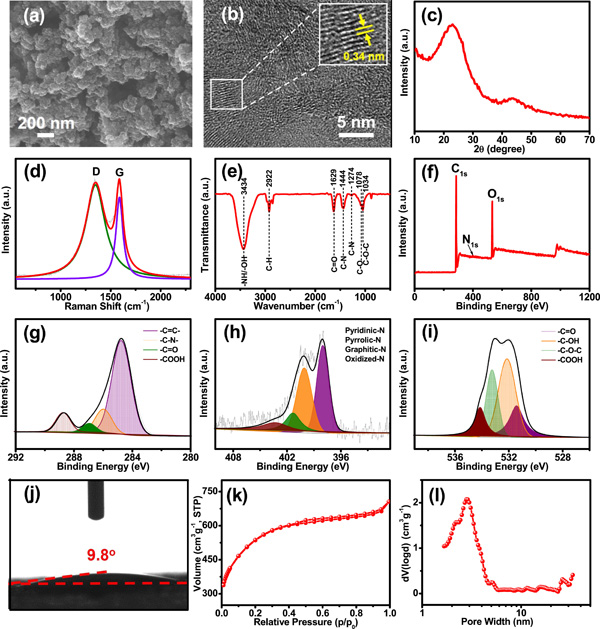 (a)FESEM图像。(b)HR-TEM图像。(c)XRD。(d)拉曼光谱。(e)FT-IR光谱。(f)XPS光谱。(g)XPS C 1s谱。(h)N 1s谱。(i)O 1s谱。(j)接触角。(k)N2吸附/解吸等温线。(l)孔径分布。
