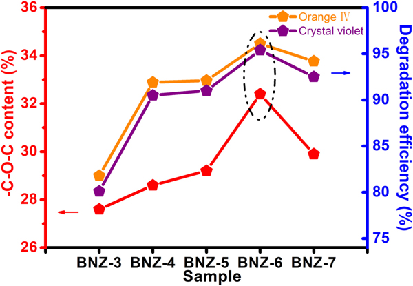 橙色Ⅳ和结晶紫与BNZ-3、BNZ-4、BNZ-5、BNZ-6和BNZ-7的-C-O-C基团含量及对应的降解效率曲线。