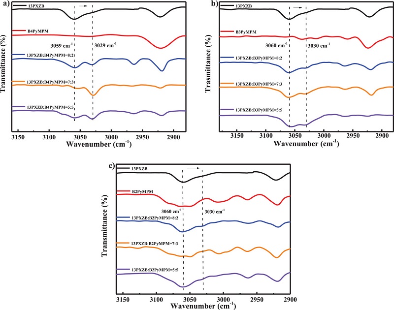 c)具有不同重量比(8: 2、7: 3和5: 5)的13PXZB: B2PyMPM及其构成成分,波数为2900-3150 cm-1。