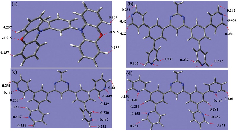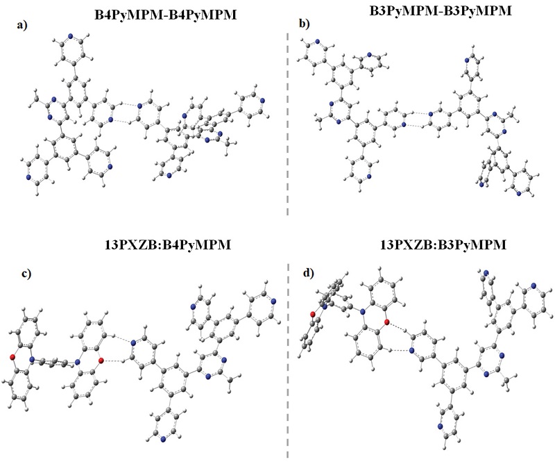 a)13PXZB、B4PyMPM、B3PyMPM和B2PyMPM的分子结构;