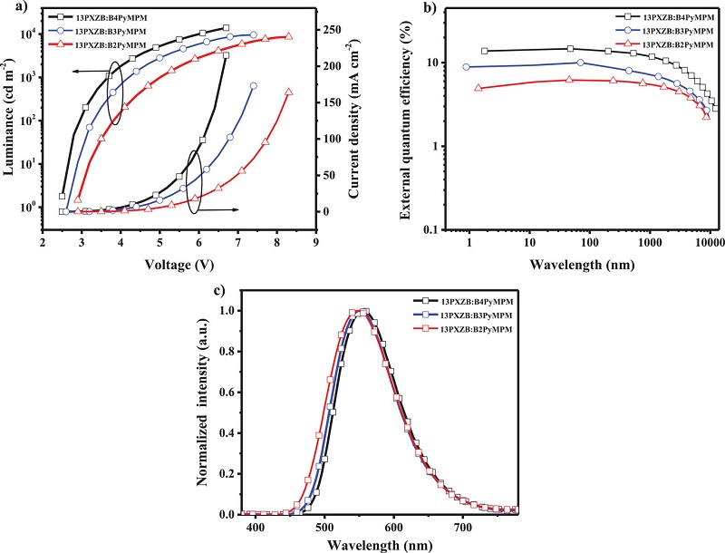 c)基于13PXZB: B4PyMPM、13PXZB: B3PyMPM和13PXZB: B2PyMPM的重量比为7:3的OLEDs的EL光谱。