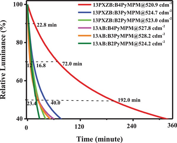 图七、不同激基复合物构成OLEDs的寿命曲线