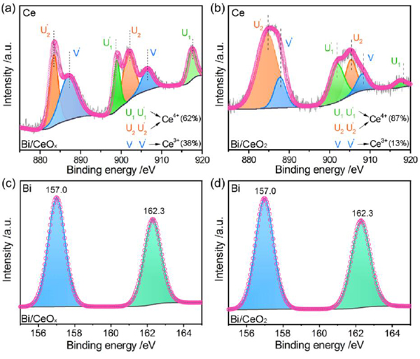 (c)Bi/CeOx和(d)Bi/CeO2的Bi 4f的XPS光谱。