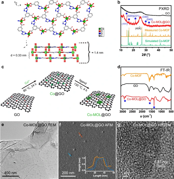 Co-MOL@GO的TEM图(e)、AFM图(f )、HRTEM图(g)