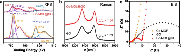 c Co-MOL@GO、GO和Co-MOF的EIS谱图