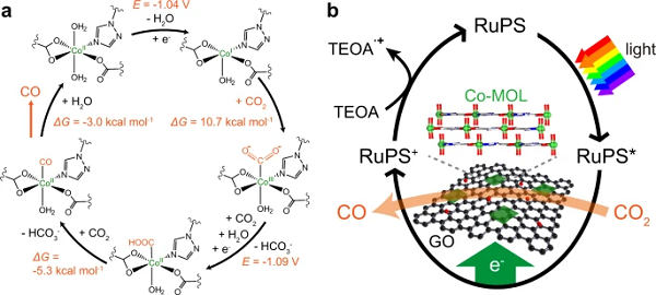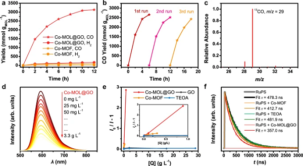 天津理工大学张志明教授(通讯作者)等人提出了简易的模板法,利用氧化石墨烯(GO)同时作为模板和电子传输介质,制备具有三分子层(约1.5 nm)厚度的MOLs。该MOL@GO可以高效驱动CO2光还原反应,CO产率高达3133 mmol g–1MOL(选择性为95%),比Co基MOF高34倍。超薄MOLs与电子传输介质之间的协同作用极大地促进MOL@GO复合催化剂CO2光还原的本质活性。上述成果发表于国际期刊nature communications上。