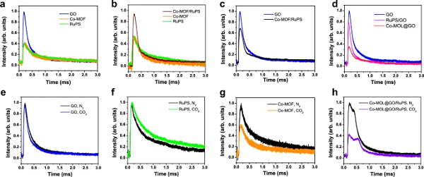 N2或CO2氛围中GO (图e)、RuPS (图f)、Co-MOF (图g)和Co-MOL@GO/RuPS混合物 (图h)的原位TPV曲线