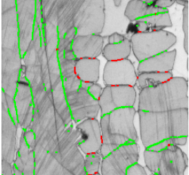 再结晶涉及到大角度晶界的迁移,所以再结晶晶粒通常被大角度晶界所包裹,利用这一点就可以判断某晶粒是否为再结晶晶粒。如图2所示,其中绿颜色为大角度晶界,被其分开的晶粒则发生了动态再结晶。