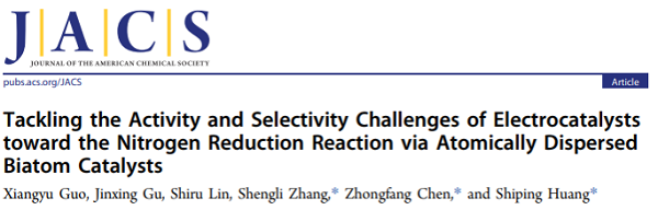 Tackling the Activity and Selectivity Challenges of Electrocatalysts toward the Nitrogen Reduction Reaction via Atomically Dispersed Biatom Catalysts. J. Am. Chem. Soc. 2020, 142, 12, 5709–5721. DOI: 10.1021/jacs.9b13349