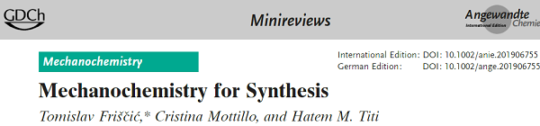 Mechanochemistry for Synthesis. Angew. Chem. Int. Ed. 2020, 59, 1018–1029. DOI: 10.1002/anie.201906755