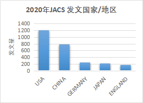 JACS在2020年的总发文量为2544篇,与2019年的2559篇基本持平,观察过去十年的发文量,JACS一直非常稳定,发文量不但没有增加,甚至还有所减少,真是科研期刊中的一股清流,只能感叹一句“JACS真的很严格”。在发文地区方面,2020年发文量最多的国家/地区是美国,中国屈居其后,但是我们发现在被引次数前十的文章中,第一通讯单位来自中国的文章达到了七篇,可以说国家科研实力的增强是有目共睹的。
