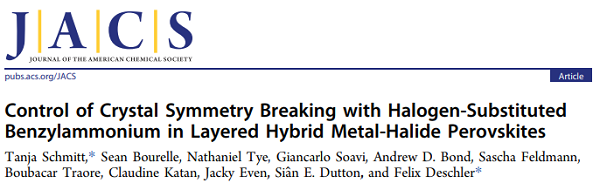 Control of Crystal Symmetry Breaking with Halogen-Substituted Benzylammonium in Layered Hybrid Metal-Halide Perovskites. J. Am. Chem. Soc. 2020, 142, 11, 5060–5067. DOI: 10.1021/jacs.9b11809