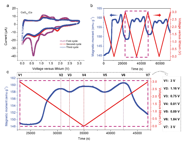 进一步CoO1-x/Co电池进行电化学循环伏安测试,结果发现相比于纯相的CoO电池的还原电位(1.2 V),CoO1-x/Co电池提高到了1.85 V(图4a)。有意思的是,其相应的磁响应信号(如图4b所示)显示出多个峰值和谷值。基于之前研究基础和已发表文章,可得出以下推论:V1到V2电压区间磁性上升来源于CoO被还原为金属钴Co;V2到V3电压区间的磁性下降源自金属钴吸收了大量自旋极化的电子;需要注意的是,V3到V4区间磁性发生了二次上升,可能的原因是自旋极化的电子由金属钴转移到了生成的凝胶状聚合物内(可由TEM观测到)形成了自由基负离子,金属钴充当了催化的作用。而充电过程的磁响应信号与之相反,且通过非在线的TEM测试可观测到聚合物凝胶状膜在充电到3V时,发生了分解,这证明了其高度可逆性,与Tarascon等人的报道一致。
