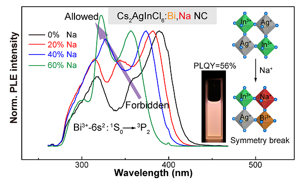 通过反向微乳液法在室温条件下合成无铅钙钛矿荧光纳米晶;通过掺杂Bi3+和Na+破坏了晶格的对称性,使得奇偶禁止跃迁转变为允许跃迁,从而得到56%的量子产率,并观察到了三重激发带的精细结构。在概念性实验中,通过将白光LED在水下运行,证明了其良好的稳定性。