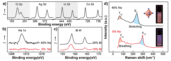 要点二:X射线光电子能谱表明成功地将Na+和Bi3+掺杂进Cs2AgInCl6基质中。拉曼光谱表明Na+的掺杂成功地打破了晶体的对称性,大大减小了晶体的奇偶禁阻跃迁。
