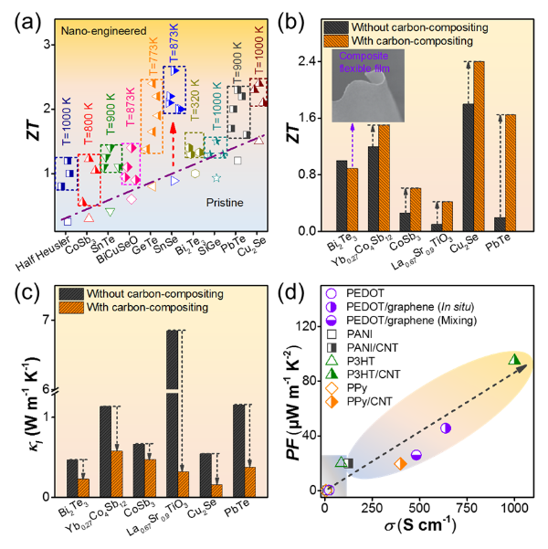 d) 不同热电材料的PF在碳复合前后和电导率的关系图。